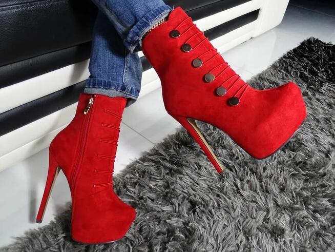 Czerwone botki na platformie zamszowe szpilki 40 Wkładka 25 Stan Bdb. Ubrane tylko kilka razy. Za wysoki obcas ...